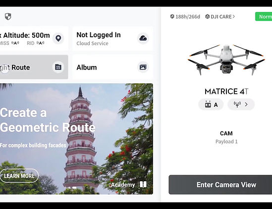 O DJI Matrice 4E suporta a Captura Inteligente 3D, que permite capturar e criar um modelo preliminar diretamente no controle remoto. Com base no modelo preliminar, ele pode gerar rapidamente rotas de mapeamento precisas próximas à superfície das estruturas, realizando medições detalhadas e modelagem de edifícios irregulares. Ele também suporta a exibição de rotas espaciais virtuais e fotos de pontos de referência para captura 3D inteligente, tornando-o conveniente para avaliar a segurança de voo e a área de cobertura de rotas específicas.